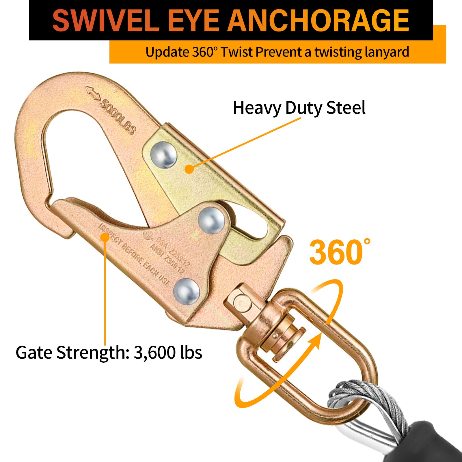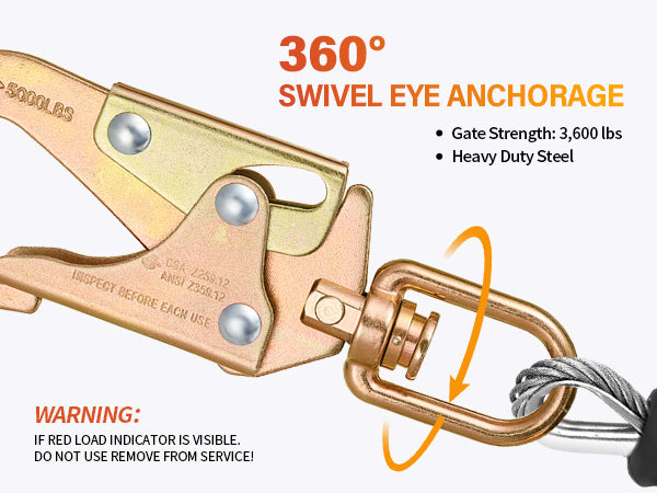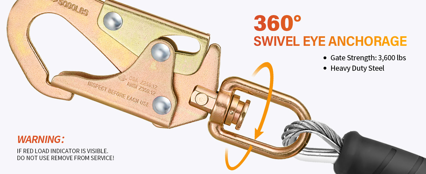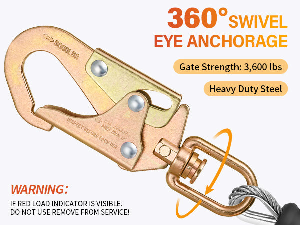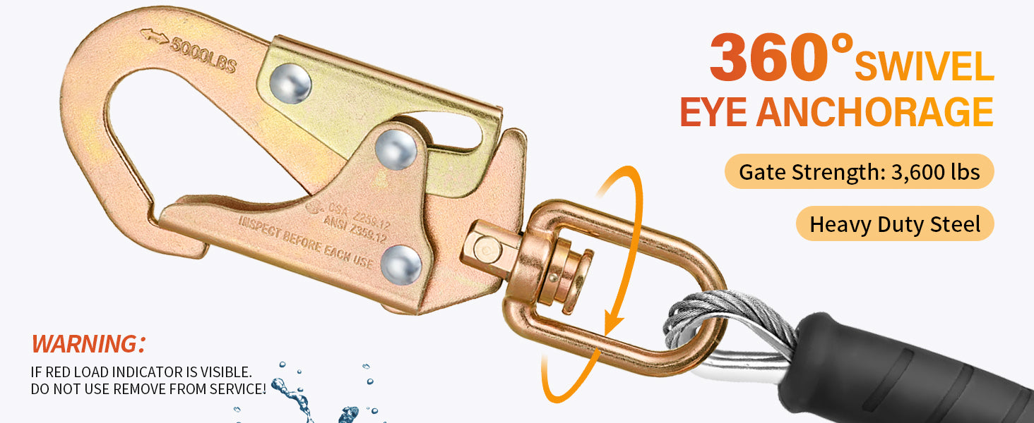 - SWIVEL EYE ANCHORAGE:This retractable lanyard with a rotating top makes your job smoother by preventing lanyard entanglement Its swivel eye anghorage makes tasks simpler and keeps the rope from winding up that has been field-tested and approved for use in different industries. IF RED LOAD INDICATOR IS VISIBLE.DO NOT USE REMOVE FROM SERVICE.