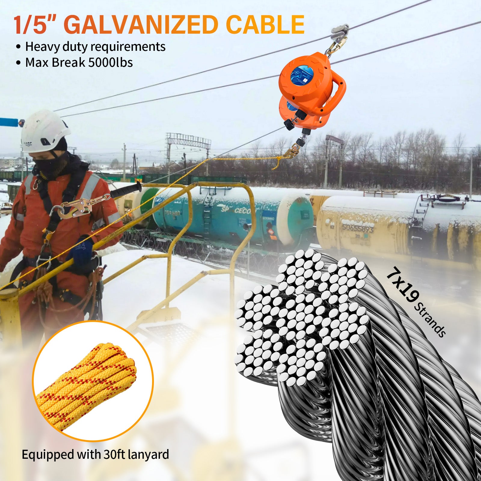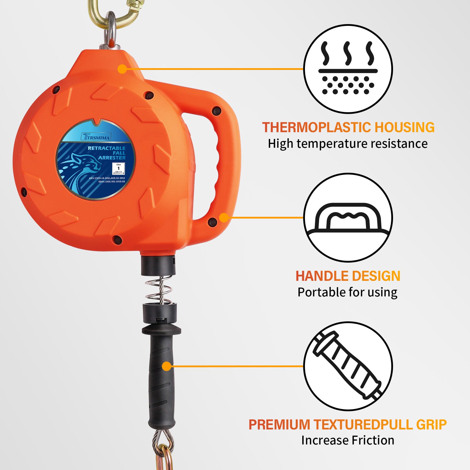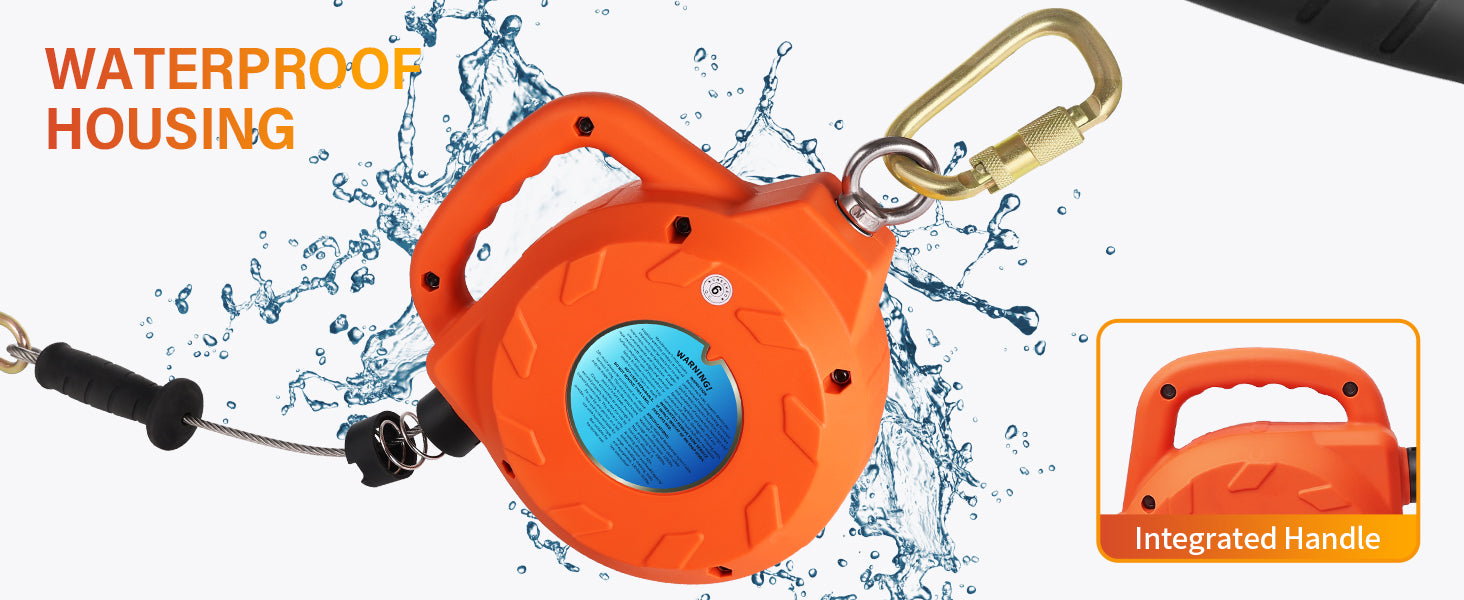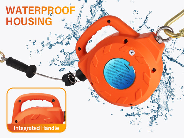 - THERMOPLASTIC DURABLE HOUSING with HANDLE: Housing made of reinforced polymer, high strength;Housing made of reinforced polymer, high strength;Waterproof, corrosion and high temperature resistance, can withstand outdoor extreme weather, and can better protect the steel cable that allows workers to work outdoors with confidence and increased safety.Preminum textured pull grip handle increase friction for easy handling.