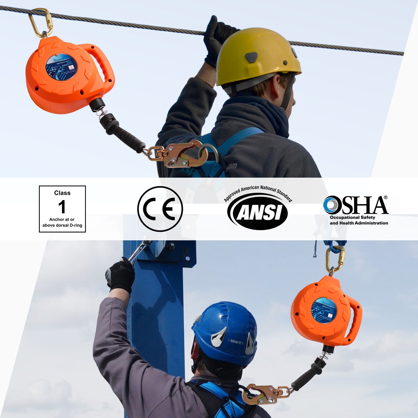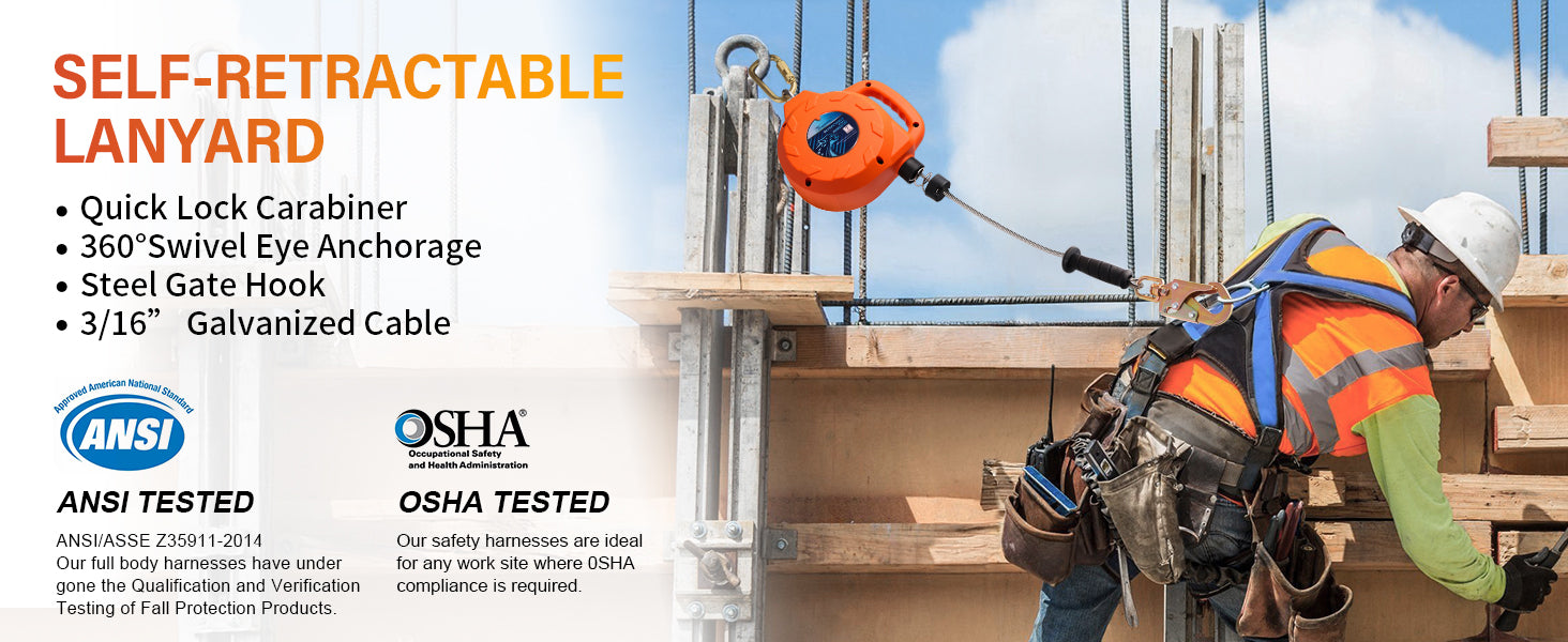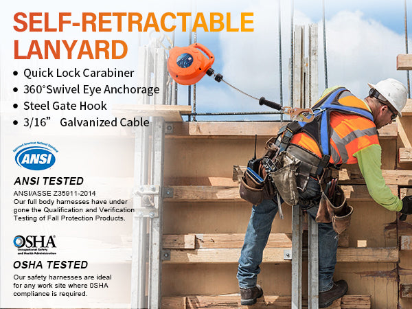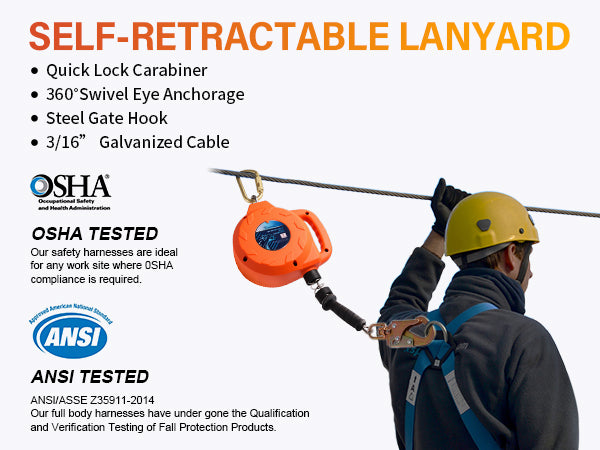- OSHA & ANSI:Compliant with OSHA,ANSI,Retractable Lanyard allows much greater travel distance without having to be re-connected to a new anchor point every few feet. It can be used for climbing on a roof or ladder, construction, roofing work, gutter cleaning, installation,steep roofs,inspection, maintenance,wind turbines,communication towers,water tanks,wells,ship yards,rigging,window washing.