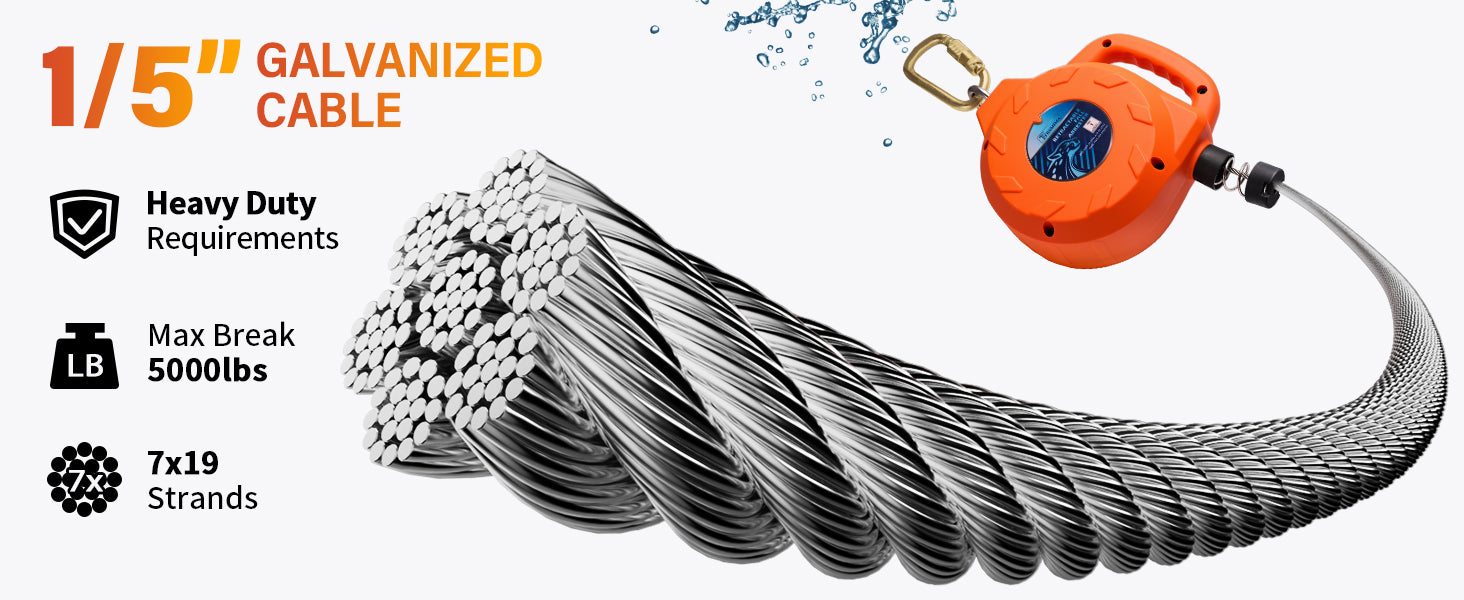 - Galvanized Steel Cable: The lifeline incorporates a galvanized steel wire rope with a diameter of 1/5”having an average arresting force of 900 lbs.that easily retracts into its heavy duty. Protective aluminum plated withstand extreme weather suitable for outdoor safe use. An auxiliary rope larger than the length of the product 20ft is included for taking the lock from below,which is convenient for repeated operations.